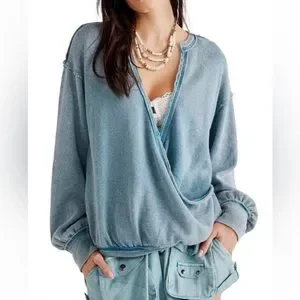 Raw edge details, plunging V neckline, slouchy oversized fit, wrap front silhouette, drop shoulders, long puffed sleeves with cuffs. 60 cotton - 40 poly
