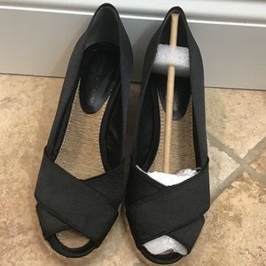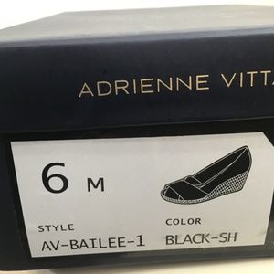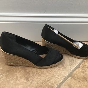 This pair of Adrienne Vittadini wedges is black with a rope heel and pretty gold trim. They are brand new in their original box and have never been worn. Only the right one has even been tried on. These would be a great addition to your summer wardrobe. I just have way to many shoes and need to clean them out.