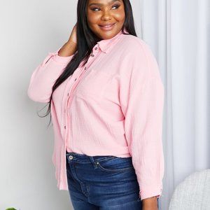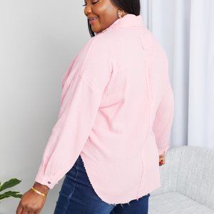 Zenana Full Size Through the Woods Gauze Raw Hem Button-Down Shirt in Dark Pink