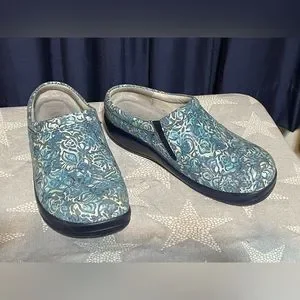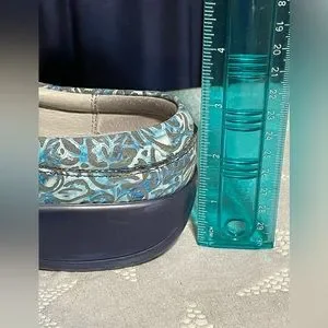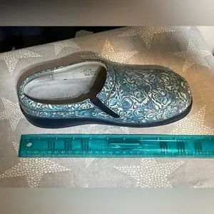 This shoe is accepted by the American Podiatric Medical Association. It features leather lined, stain resistant coating with comfortable fit elastic edging. It has a cushioned heel, and the inner suede lining accentuates breathability for comfortable, all day wear. This is a gently used, non-marking, slip resistant shoe (see pictures).