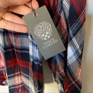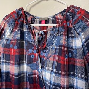New with tags embroidered peasant blouse from Vince Camuto. Billowy puffed sleeves and intricate floral embroidery. Split neck with ties. Long puff sleeves. Plaid print. Button keyhole wrists.