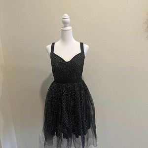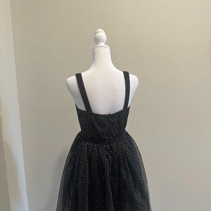 Little black dress with some sparkle! Polka dot print sparkles and shines. Fitted bodice with light padding in bosom area, with tullle skirt.