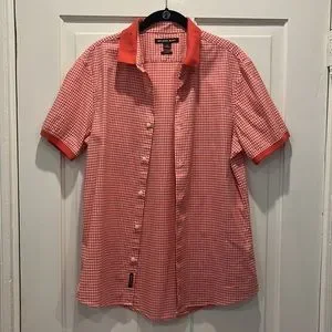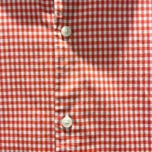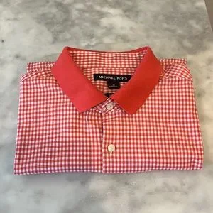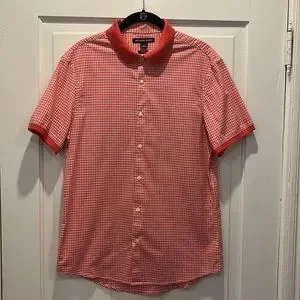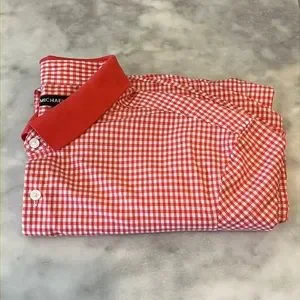 Michael Kors Men’s Button Down Short-Sleeve Shirt. Size Medium. Slim fit. Color is a nice orangey pink. Fabric is 96% Cotton and 4% Elastane. Worn once. No rips, stains or odors. Extra button still affixed to inside tag.
