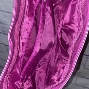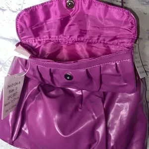 Beautiful purple color with purple lining on the inside. Snap closure and two slip pockets inside on one side and other side is one zip side pocket.