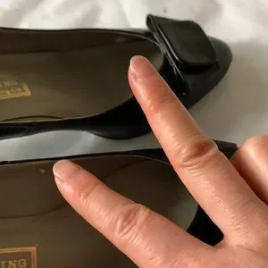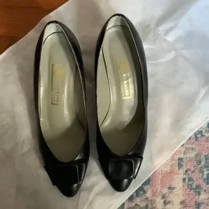 This 2.5” heels leather shoes are black color. They are so pretty with front decorations. They are very comfortable and in very good condition except there are some minor wear and tears showing in photo.