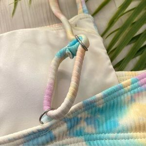 Keep the vibes high in and out of the water with the Square Bralette bikini top. Saturated in sunbaked psychedelia, this women's bikini top shines in a bold rainbow tie-dye print on recycled rib fabric. 💕🏝️ The skimpy coverage is ideal for soaking in endless rays, with the removable cup inserts and adjustable straps let you customize your shape and support.