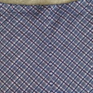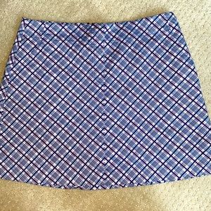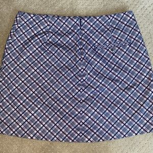 Lady Hagen Sports Skirt/Skort. Great for golf, walking or anywhere! Size 8. In beautiful, like new condition. Very pretty blue, red and white plaid pattern on cotton/spandex blend material. Fully lined with polyester/spandex shirt. Zips in back. Has one back pocket and two front side pockets. Comes with extra button. Approximate measurements: waist when flat: 15 “, length: 16”. See pictures for color, style and condition.