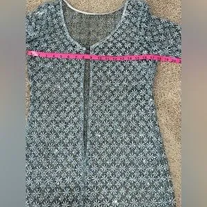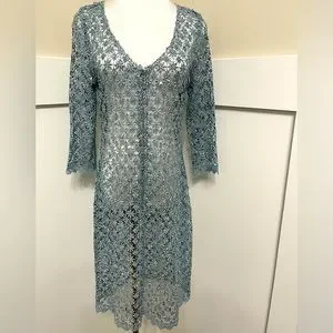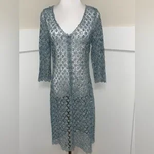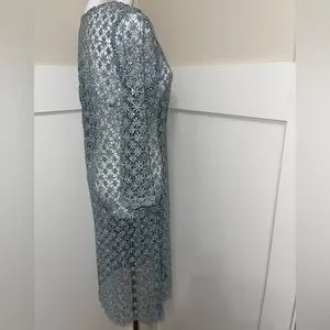 Pictured is a preowned but excellent condition metallic blue lace sequin dress by Cachet in the size small. Additional features includes a front zipper closure and 3/4 sleeve length. This item is not lined. You will need to add a slip dress or the appropriate cover-ups of your liking underneath. The measurements are pictured above. Super sexy yet classy!