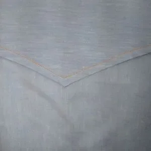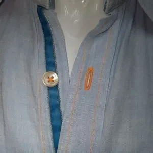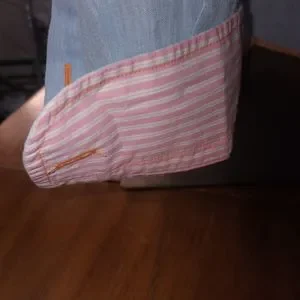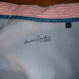 In excellent pre-owned condition, 55% linen, 45% cotton, light blue with pink striped trim, orange stiching turquoise velvet button placket, M, runs big.