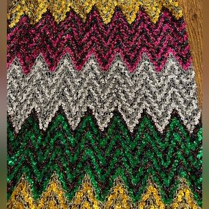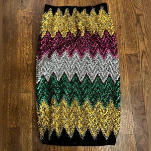 Brand New with Tags, Zara Black Knit Fully Embroidered Pencil Skirt with Gold, Hot Pink, Silver and Green Sequence in a Zig Zag Print. Size M