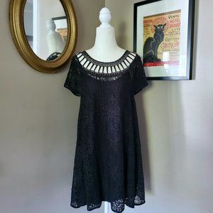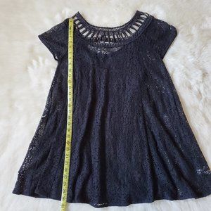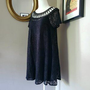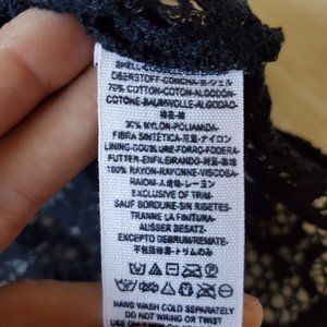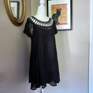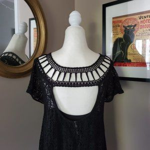 Sheer crochet mini swing dress features a cutout neckline and an opening in back. Cap sleeves. Black slip has adjustable straps and is attached to outer dress with snaps. Dress is 70% cotton, 30% nylon. Slip is 100% rayon.