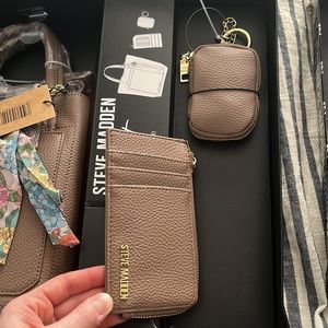 Brand New. Never used. Still in box. (Price tag cut out where price was listed. Box dented. See photo. Perfect for a gift!) Gift set includes: a mini tote, scarf keychain, earbud case, and card case. Color: Mushroom