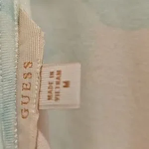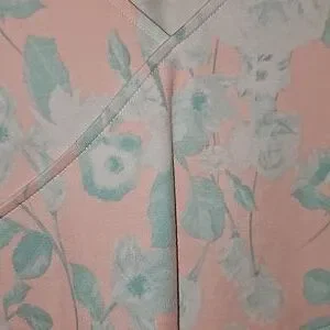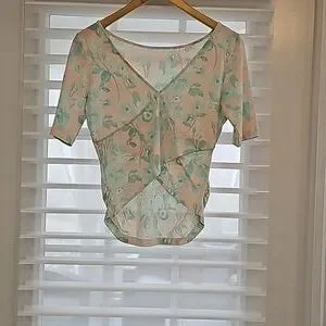 pastel like ballerina pink with green floral rose design top. High/low cut. Stretchy cotton material. Care label has been removed, however, never worn. Cotton with light stretch. Like New.