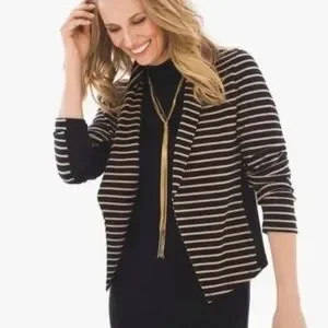 Zenergy by Chico’s open drape knit cardigan blazer jacket in sienna stripes of black and neutral brown. Has a notched lapel and black ribbing fabric on the side of jacket and sleeves. A lightweight and versatile piece that can take you from fall to spring.