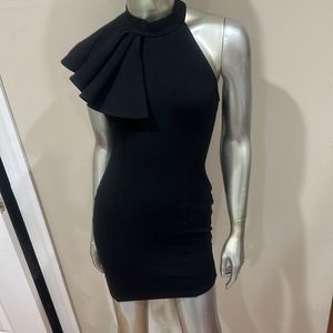 Elegant little black dress ruffle detail side shoulder mini fitted LBD size M