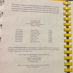Junior League of Cobb-Marietta cookbook “Georgia on my Menu, A Medley of Southern Hits.” Copyright 1988, eight printing 2003. In perfect condition! Looks like it’s never been used!