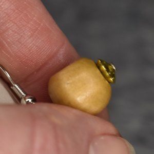 New with original package. Single wood bead dangling from the fish hook back. One of the beads is flat on one side.