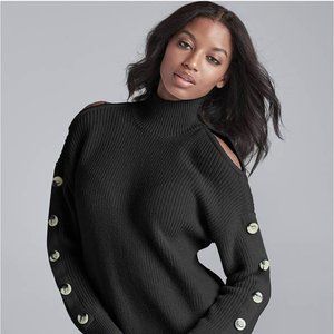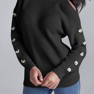 (V84) Venus Women’s Black Cold Shoulder Sweater Medium Long Sleeve Button Detail