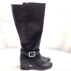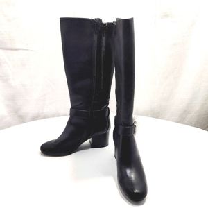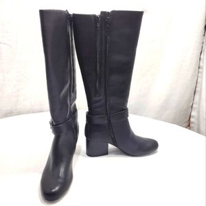 NWOT Black Knee-High Boots with 2 zipper closures. These have an eye catching statement silver tone buckle on the side that is adjustable. There is a comfort foam footbed with a padded insole to soothe and pamper your feet. They are stitched with precision allowing for string and robust inseams with sturdy and resilient soles.