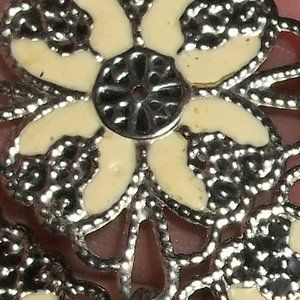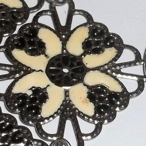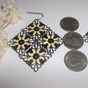 These pre-owned statement earrings are sure to brighten your day. They are costume jewelry and dark silver toned filigree design. They have buttercup yellow enamel flowers. The pair dangle and drop from French fishhook ear wires for her pierced ears. Measure 3 1/4 inches tall and 2 7/8 inches wide. Each single earring weighs 4.8 grams. The perfect fashion accessory to elevate your look. Buy it now before someone else does!