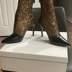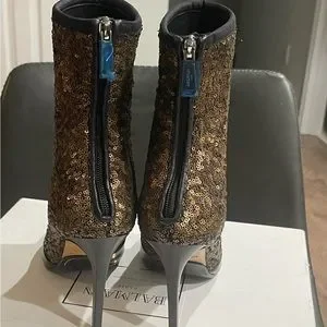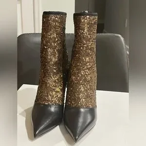 Bronze/Gold and black sequins booties. 4 inches never been worn. Box and dust bag included. Zipper still wrapped in plastic. I wear an 8 or 8 1/2. These are a 9B/39. I could never zip the back. If it were a side zip I would have been able to wear them.