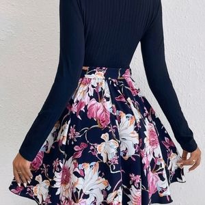 NWT adorable long-sleeved dress with navy blue ribbed mock-neck top and flowy white, pink, orange and blue floral print skirt with matching sash that ties in a bow around waist. Never worn, in perfect condition.