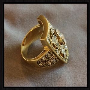I love this unique, fun ring! It has been spending it's days in the jewel box lately, so it's time to find it a new home. Size 8. Really nice condition. All stones intact. Has a bit of normal wear marring on the bottom (inside of hand), but overall great condition!