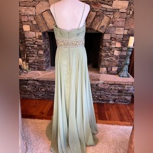 Light green, perfect condition formal dress with beading at the waist. Chiffon bottom. This is a lovely dress. Great for prom, wedding, New Year's.