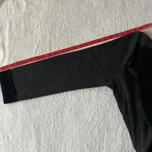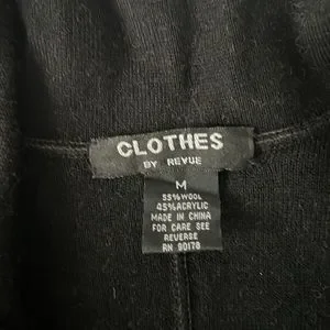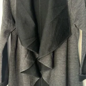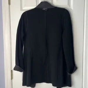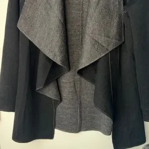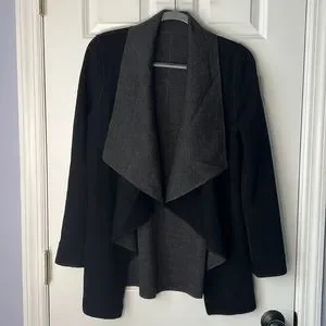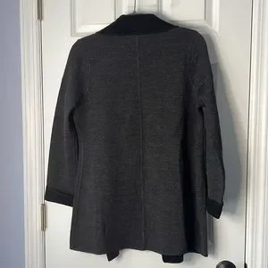 Reversible sweater jacket ladies size M. Jacket can be work with black side facing out or with slate gray side facing out. The two colors are visible and compliment the styling on the jacket regardless of which side is facing out. Jacket drapes open (no buttons or fasteners). Great for the office or casual with jeans.