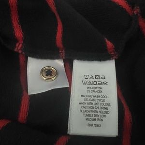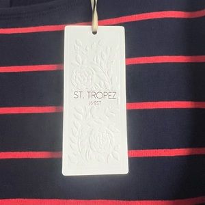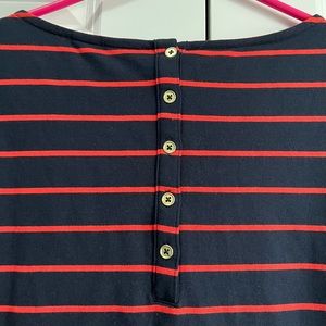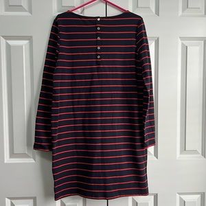 St. Tropez navy and red stripe long sleeve t-shirt dress. Has five gold buttons to close back. Measures 35 inches from shoulder to hem and 19 inches from pit to pit. Extra button included.