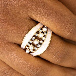 Flecked in shell-like iridescence, shimmery white bands join around a bubbly pearl drop and white rhinestone center for a refined look. Features a stretchy band for a flexible fit.