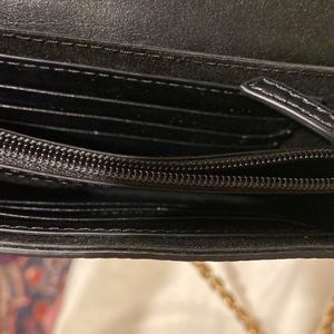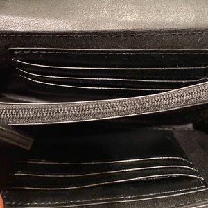 - Interior features 1 zip pocket, 1 slip wall pocket, 6 card slots