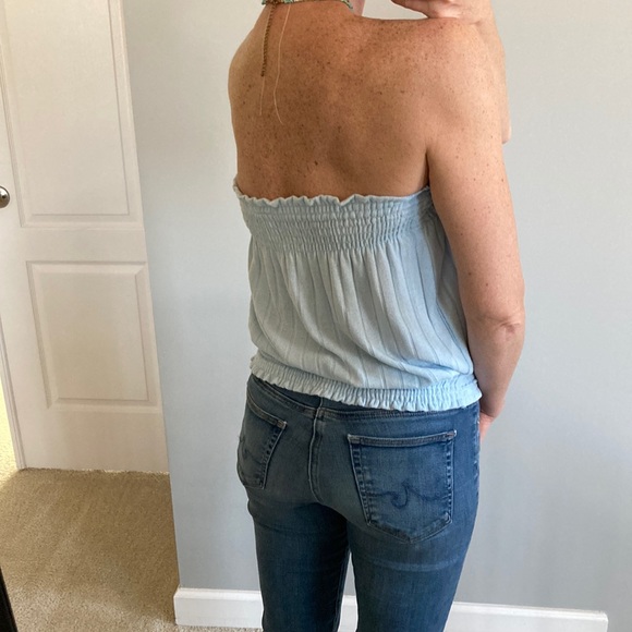 Light Blue Ribbed Tube Top. Fabulous under a kimono, jacket or sweater or alone! Smoked at the top and bottom. Ribbed bodice. Soft and lightweight. 100% rayon. I am modeling size medium. New boutique item.