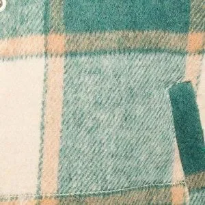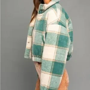Plaid cropped puffer jacket with zipper and button down closure and elastic around waist. By Le Lis Collection.