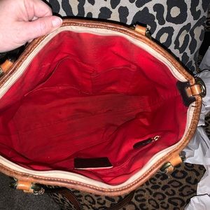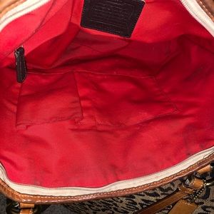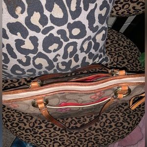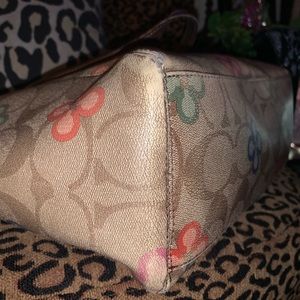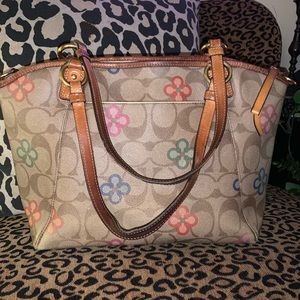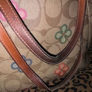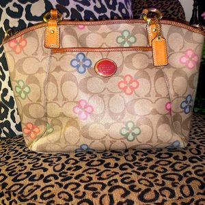 I believe this bag is a rare Coach purse. It is the original signature C genuine leather with with a pop of colorful clovers! Red interior lining. It shows some wear and a few flaws but it is still in B+ condition! No rips or tears that i can see. A lot of life left to live in this bag! It does not have the long strap but can be purchased if you desire.