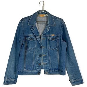 Vintage wash, denim constructed jacket from the vintage brand Rustler, with a button closure, and collar. Size medium.