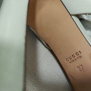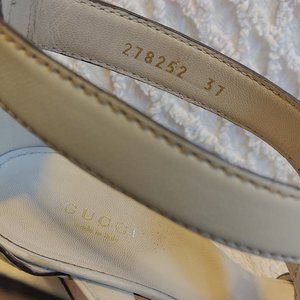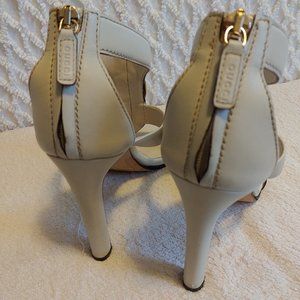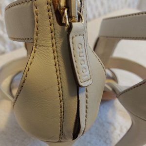 GUCCI stamped on rear Zipper Pulls. Caged Sandals with Ankle Cuff. Serial Number stamped inside Ankle Cuff, as shown. Sophisticated Bone Color.