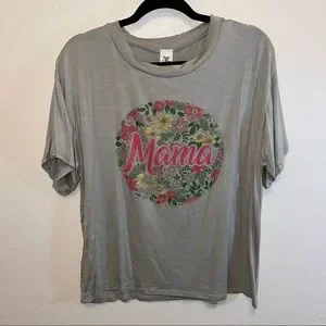 Green Pink Mama Botanical Floral Leaf Graphic Tee Shirt. Round neck and short sleeve t. Light green shirt with pink and yellow flower and leaf print all over with pink cursive writing “mama” on the center.