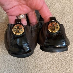 These adorable, patent leather and regular leather Tory Burch ballet flats are a very dark brown and black. Good used condition, the wear is where no one else can see it - on the soles and the insoles. See pictures. Very comfortable and stylish, goes with everything! Gold hardware on the back with the brand hit.