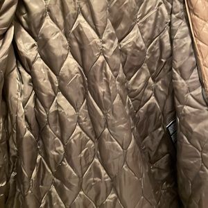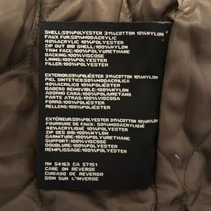 Amazing coat! Guess anorak style coat in olive/army green with camel and black details. You can zip out the camel hood or keep the hood and remove just the fur. Tons of adjustability in the waist and hem. Many great functional pockets
