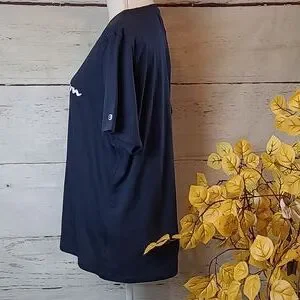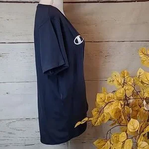 Short sleeve, longer in the back, navy blue, crew neck, champion tee.