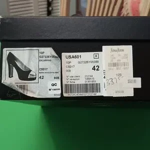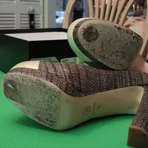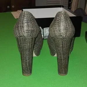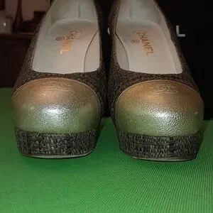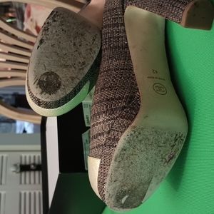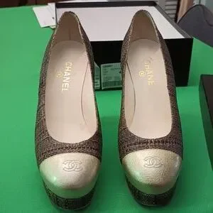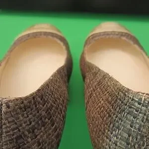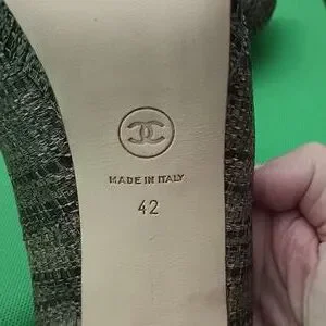 These are a size 42 which I think is an American size 11 ish. They are a tweed shoe with a gold toe. They were worn once. In original box.