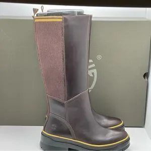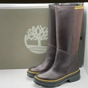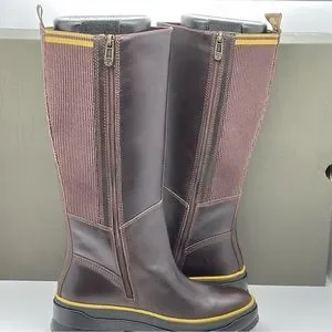Illuminating pops of yellow give a modern vibe to a sleek leather boot designed with stretchy knit panels and a thoroughly lugged sole.