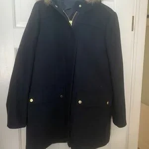 A never worn size 6 navy blue coat with a fur hood from J Crew.