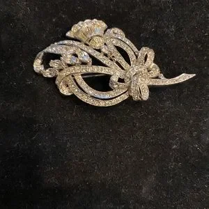 Old costume brooch 2 1/2” width x 1 1/2” length. It has one stone missing but is barely noticeable.