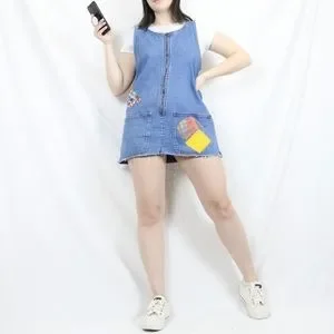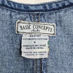 Light wash blue denim pinafore style mini dress with a zipper and pockets on the front! Has super cute fabric patches and a raw hem. Quite short so would recommend for someone under 5'5". From the vintage brand Basic Concepts, fits like a medium/ large.