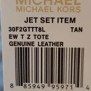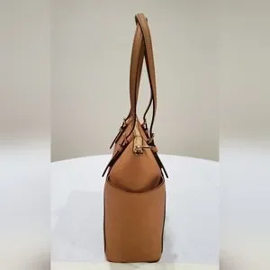 A Michael Kors Jet Set East West Saffiano Leather Tote with gold-tone hardware and a fully lined 100% polyester interior with leather trim. This Michael Kors tote features 2 end open pockets, 1 interior zip pocket and 3 interior wall pockets; two buckled leather handles with a 9" drop.