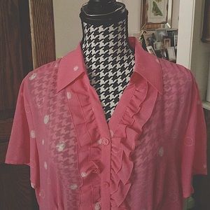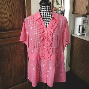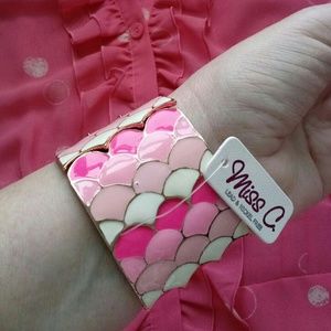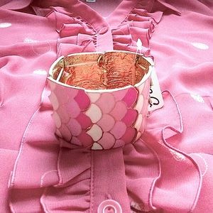 This sheer short sleeve pink/peach button down blouse has a creamy white polka dots & circular outline design ( 2nd photo shows accurate colors) and ruffles bordering the front buttons stopping at the waist. 21.5" from underarm to underarm to underarm, 7" sleeves and 27" from back of neck to hem. The NEW WITH TAGS enamel METAL stretch bracelet is striking with a scalloped pattern in cream/shades of pink and outlined in gold finish [3rd photo]. Exceptional NEW WITH TAGS/pre loved condition.