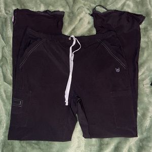 Urbane Performance Endurance cargo scrub pants, black, 5 pockets, size small tall, back bottom has wear from being too long, pet friendly and smoke free home