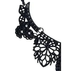 Stylized Swooping Bird (Owl, Eagle)Japanned Black Filagree Panel Rhinestone Bib Necklace.